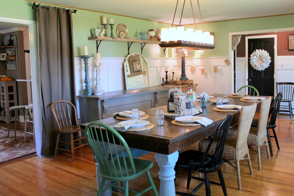Wood is a kind of identical material for making a dining table. Goodbye 1970s particle board paneling hello beautiful new built-ins. Examples of farmhouse dining room decorations include old cupboards handmade pillows wooden tables and chairs floral wreaths delicate china and old-fashioned decorations.